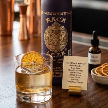 - Pour 2 oz of Raca Leza Mezcal Ensamble