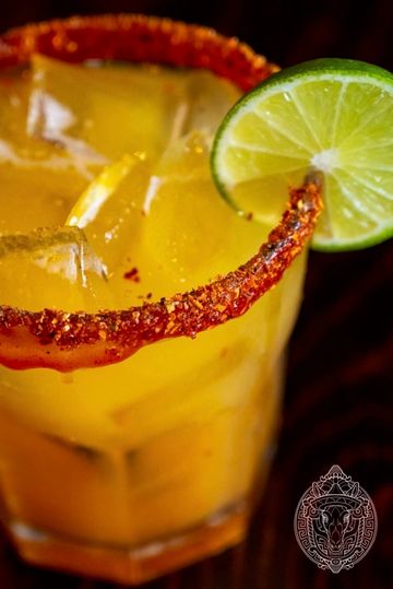 - Rim glass with Chamoy and Tajin.